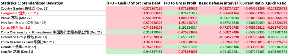 图二为各家房企的流动性统计与同行业上市公司(共22家)的平均值对比,低于均值使用红色填充、高于均值则使用绿色填充(The larger, the better)。放眼望去,红色单元格的数量显然更多,粗略可见超大型开发商的短期窘迫;将个体与行业平均的差异标准化(Standardization)后(如图三),不难看出前十家房企在不同维度的分化颇为明显(劣者如恒大,某指标落后平均值两个标准差;良者如金地,某指标领先均值两个标准差以上)。
