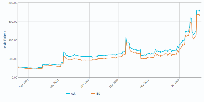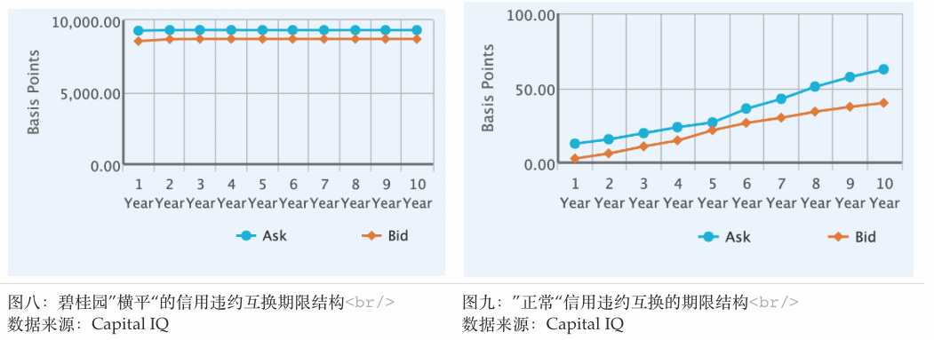 将目光转向各家的偿付能力(Solvency):从经营现金流对利息的覆盖倍数来看,中海外与龙湖暂无忧患,而万科(甚至是负数)与保利则拮据不已;从现金流占总债务规模的比例来看,万科、保利与华润稳固垫底,中海外落后于行业平均,而龙湖则勉强持平——由此推测,龙湖与中海外的长期低息债务占比较高、而短期债务占比较小(如图六、图七所示);融创尽管历史数字亮眼,但事实上早在22年5月已有一笔美元债出现实质性违约,可见一年过去早”人是物非“;有关债务与收入的比值中,营销手段更为激进的碧桂园与绿地曾经优于行业均值,但在购房者信心沉底的今日是否还能玩得转?此处需要打上大大的问号——CDS期限结构(如图八)以及相关债务违约的新闻已经将泡泡戳破。