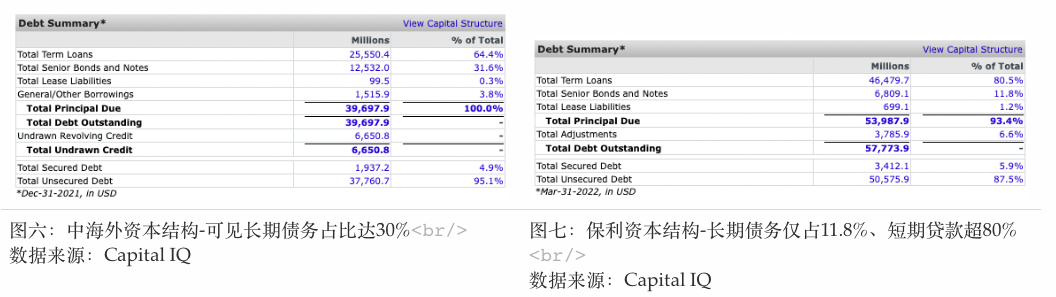 从现金对短期债务的覆盖倍数来看,恒大、绿地以及华润都远落后于行业均值,而龙湖与中国海外发展公司则现金储备充裕;然而在 Defense Interval 的对比中,中海外反倒落后于行业均值,原因或许是其短期债务总量较小故而显得现金相对厚实、而效率不足使得流动资产不足以覆盖一年的经营与利息开支。短期流动性指标显示,除龙湖与中海外两家外,剩余八家在短期内偿债与周转的压力颇为明显,其中恒大、绿地以及华润的情况不容乐观、即将在23年迎来偿债小高峰。