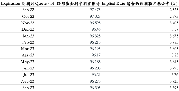 而上述新闻中提到的期货通常指在芝商所(CME)交易的30天联邦基金期货(30 Day Federal Fund Futures, FF),其到期结算价格等于(100 - 结算月EFFR的算术平均数),因此在到期结算日前每个交易日 FF的价格变化可以直接反映对合约所在月联邦基金利率水平的预期。举例而言,2022年9月的 FF 将在2022年10月1日进行结算,则其结算价格为 (100 - 9月每日 EFFR 的算术平均值);随着时间逐渐接近9月底10月初,9月合约 FF 的隐含利率也将与 EFFR 逐渐收敛(如下图)。