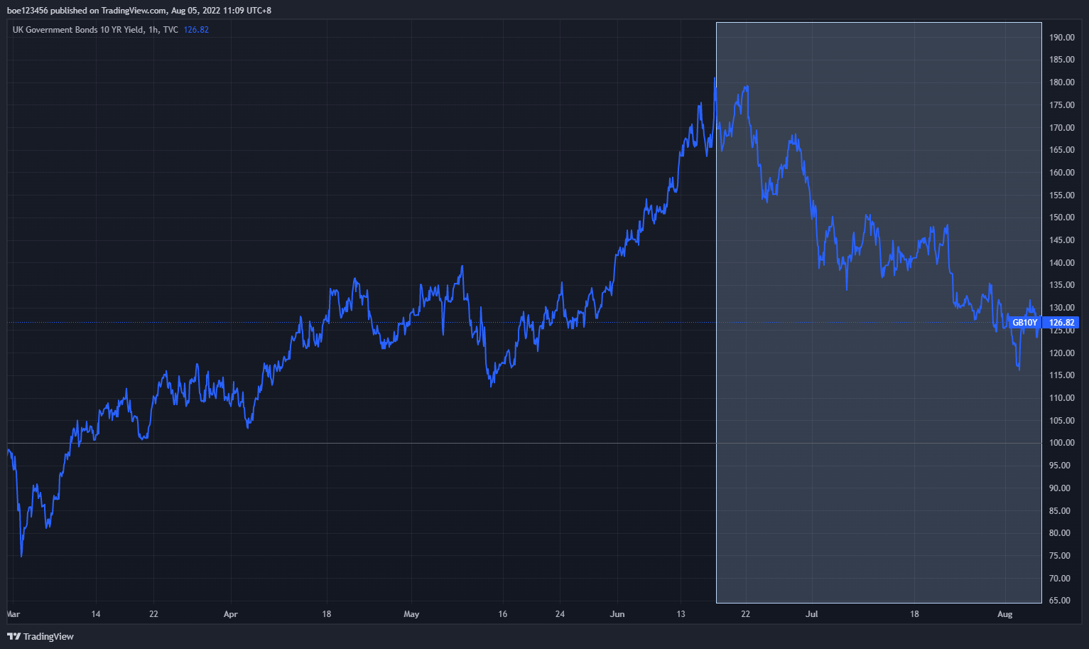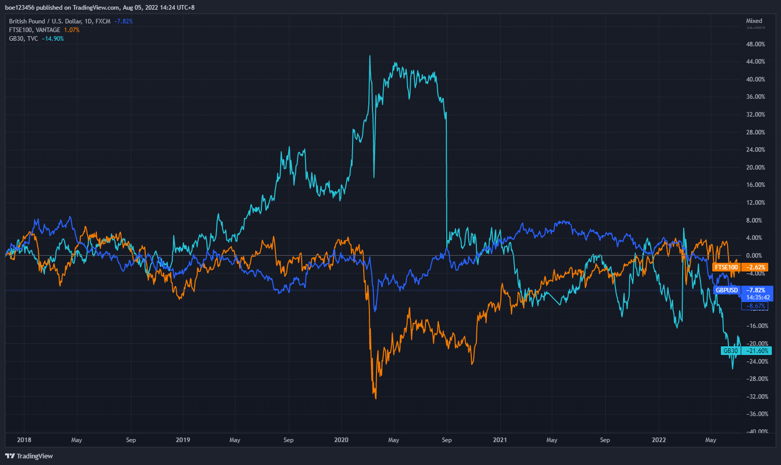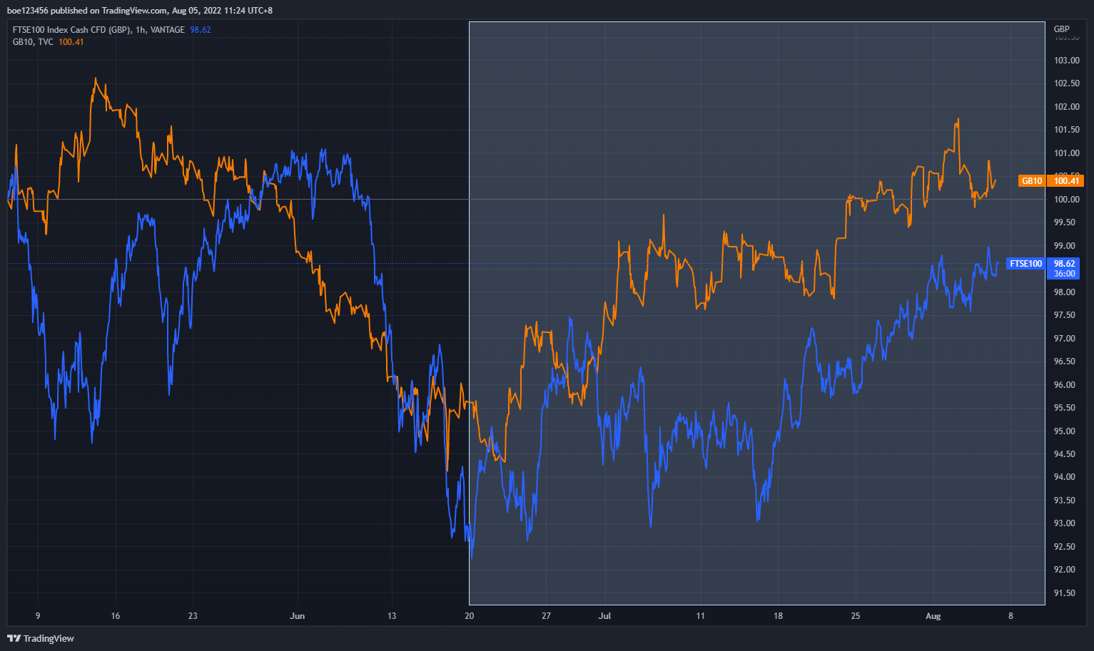 "Ten-year government bond yields had fallen..." equals "bond price had risen", implying that investors had been chasing it passionately given current risk aversion. That is to say, they were looking for a haven when storm was coming in. As shown in the second chart, since July 20, 2022, UK gov bonds has gained more than FTSE 100 has. That is why BoE remarks it as "Market participants now expected that central banks in major advanced economies would react more forcefully to near-term inflationary pressures, but could need to respond to weaker activity thereafter."