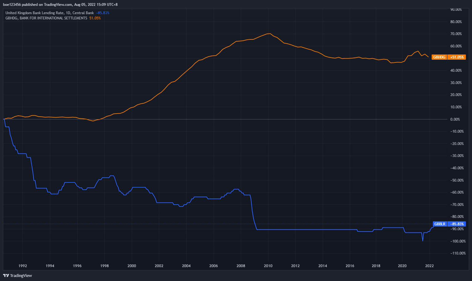Lending rates is one aspect of credit conditions, and these rates are usually floored by upstream risk-free market rates (like inter-bank rates). It is a direct measure of households' financing cost, which will then affect their consumption and investment, as is shown in the 2nd chart below. With looming recession, UK families is now facing higher cost of debt owing to the shortage of fund supply.