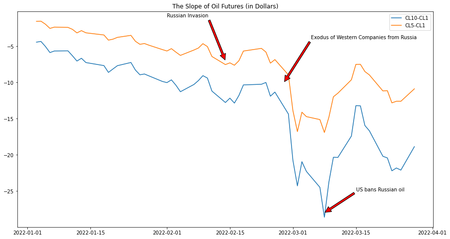The relationship between commodity spot and futures prices can in part reflect the perception of short-term physical scarcity (Shaun and Neşe, 2010). The slope of the futures curve, measured as the difference between the price of a futures contract at some given maturity and the spot price, can provide information on whether market participants anticipate relative abundance or scarcity in the physical market. Below the figure shows how the slope of oil futures changed as crisis escalated. 'CL1' stands for Generic 1st 'CL' Future.