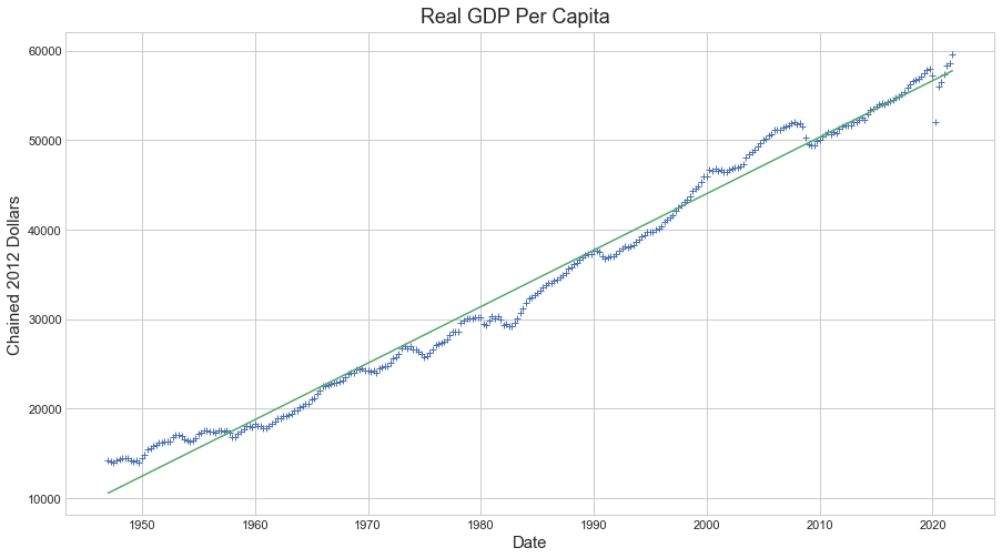 在明确了何为生产力、何为生产力增长、以及如何具象化这一指标之后,重返现实世界,下图蓝色的“+”表示的是美国人均实际GDP。可见在过去的八十年里该指标的增长十分稳定(粗略计算可得其年均复合增长率约为1.5%)、围绕绿色的趋势线波动地上升。对此瑞老师的解释是:此处的稳定增长主要源自科学技术(知识)的缓慢进步,从而带动生产力发展与生活水平提高。生产力的增长固然稳定,但其间的波动也是不容忽视的。众所周知,新知识是难以忘记的(不是说你我脑袋里的那些)、新技术是难以摒弃的,所以生产力的波动并非主要来自于知识与技术的变化。其间的原因究竟是什么?