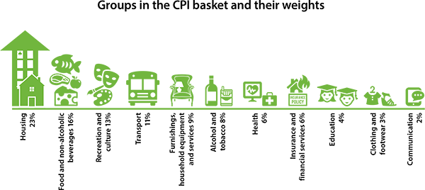 关于度量,通货膨胀早已有了世界公认的标准,其中最为知名的便是消费者价格指数(Consumer Price Index, CPI)的变动。根据中国国家统计局的定义[5],CPI 是”通过一组代表性消费品及服务项目随着时间的变动,反映在居民家庭购买消费品及服务价格水平变动情况的相对数“。这”一组代表性的消费品和服务“包含的项目颇多,以澳大利亚版定义为例(下图),其内容涵盖住房、食品、娱乐、交通、医疗以及教育等诸多门类(确实很有代表性)。