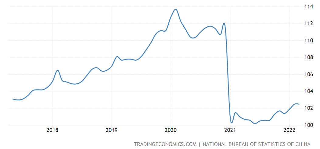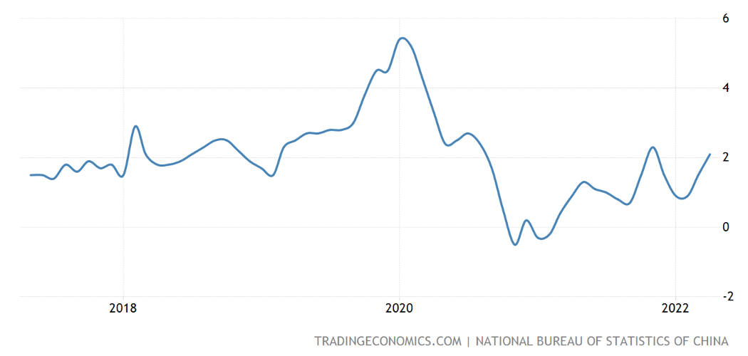 尽管通货膨胀率(或CPI)仅是作为反映普遍价格变动的**滞后**指标[^6],但这并不意味着它毫无用处。通胀率一方面可以对此前发生的影响普遍供给需求因素的事件予以确认,另一方面可以据此对后续连锁的经济反应做出预测。就上图的中国通胀率而言,其数值从2022年3月份的1.5%加速增长到4月份的2.1%(2021年11月以来的新高),由此可以定量地验证严格的 COVID-19 管控措施引发的物流中断对物价造成的影响。