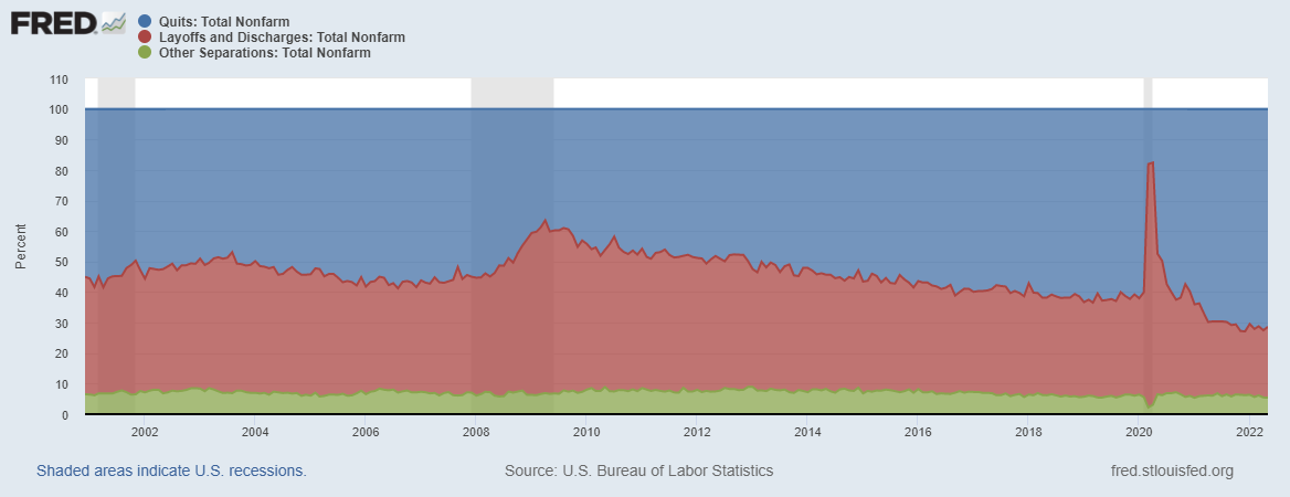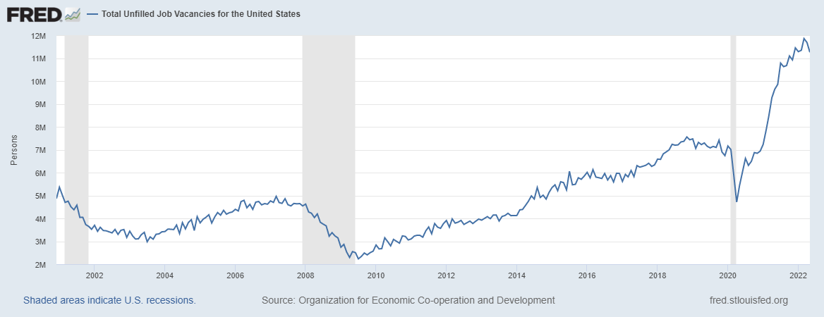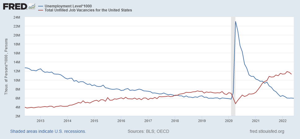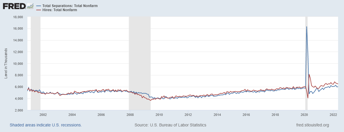 Yesterday when I was reading the the transcript of Chairman Powell's speech, one aspect which he often mentioned suddenly caught my interest. He talked a lot about current tight employment market where job vacancies and unemployment reflect extremely strong aggregate demand (also, as Total Hires shows); and this seems to be one of the underlying support for this pseudo-dovish 75bp hike.