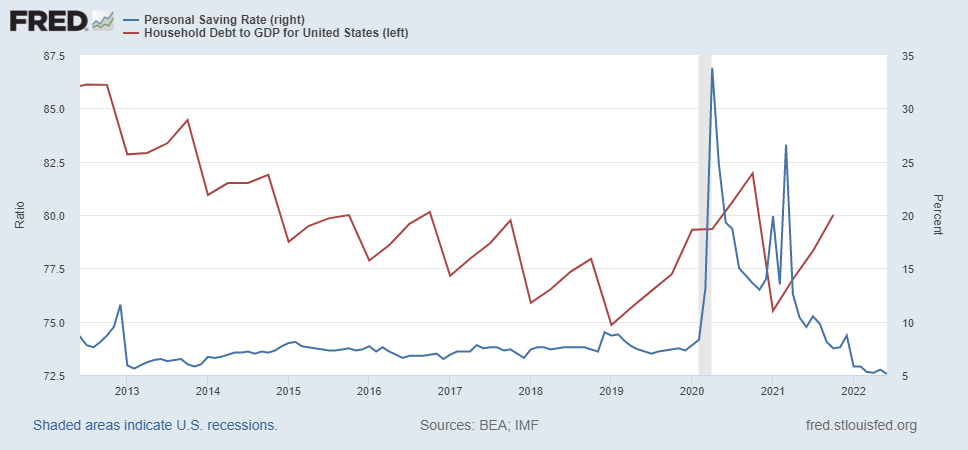 One research (to which I cannot get access now) mentions that although the market is tight, the growth of wage in potential job changes is very limited compared with intimidating inflation. So one scenario, saying workers are facing only the same or lower level positions than before, is quite convincing, given firms may willing to cover the rising cost in the first phase. As a result, those wage and salary works would rather stay at home, living on COVID cash subsidies and having fun.:happy: Personal saving rate used to peak during COVID and now are falling sharply with debt under recover (as Fig 5 shows).